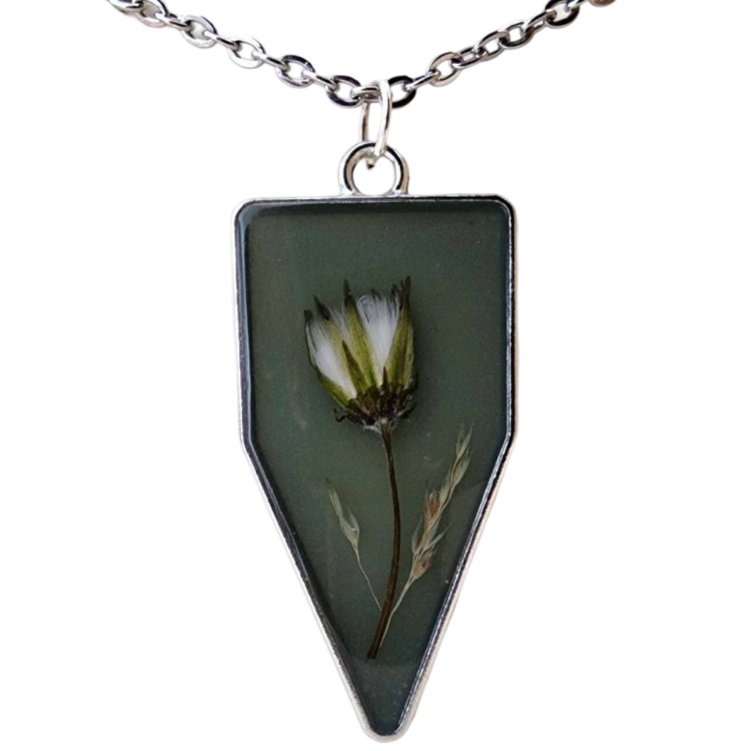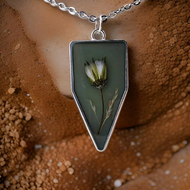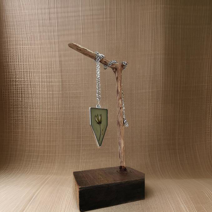 Materiales: Flores silvestres recolectadas a mano, resina y aleación. Cadena de acero inoxidable.