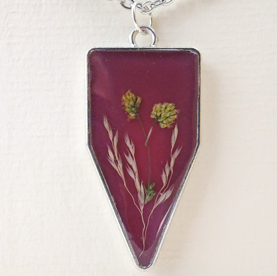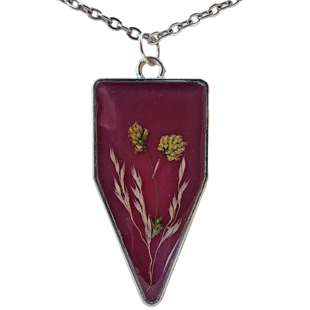 Materiales: Flores silvestres recolectadas a mano, resina y aleación. Cadena de acero inoxidable.