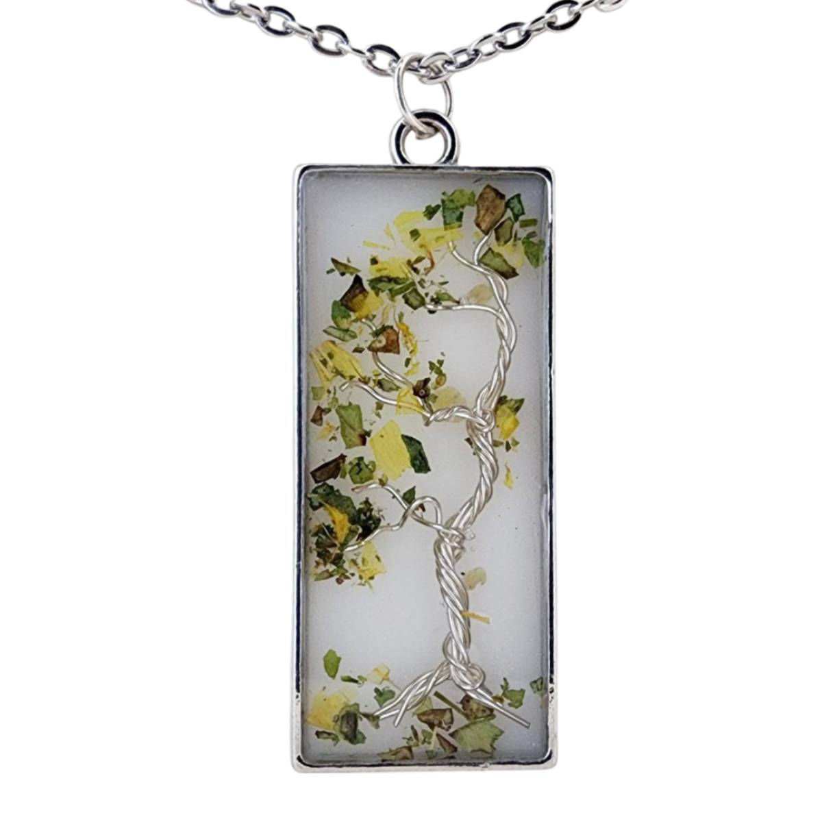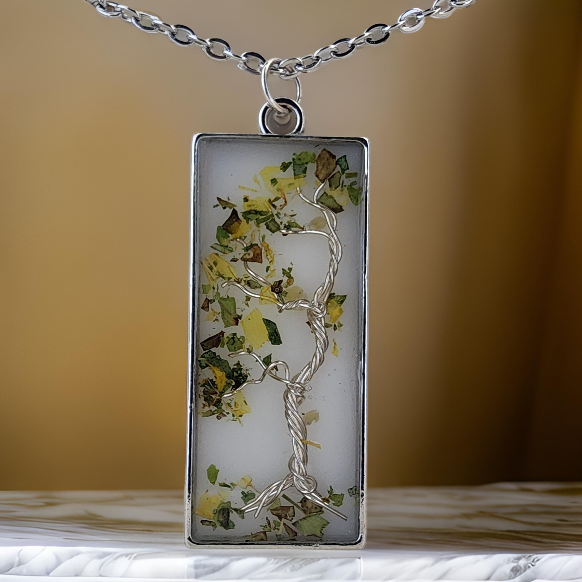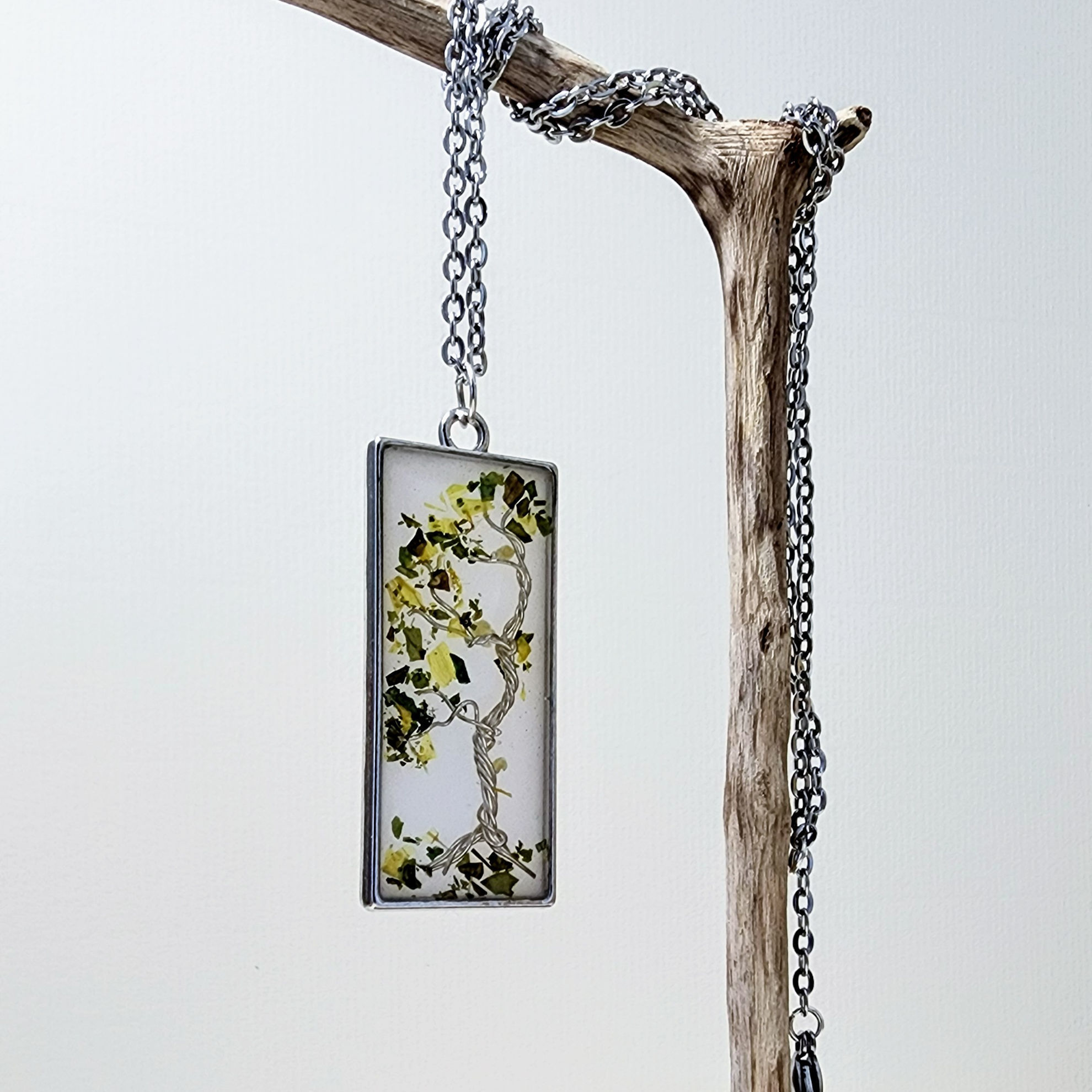 Materiales: Flores silvestres recolectadas a mano, resina, aleación y alambre. Cadena de acero inoxidable